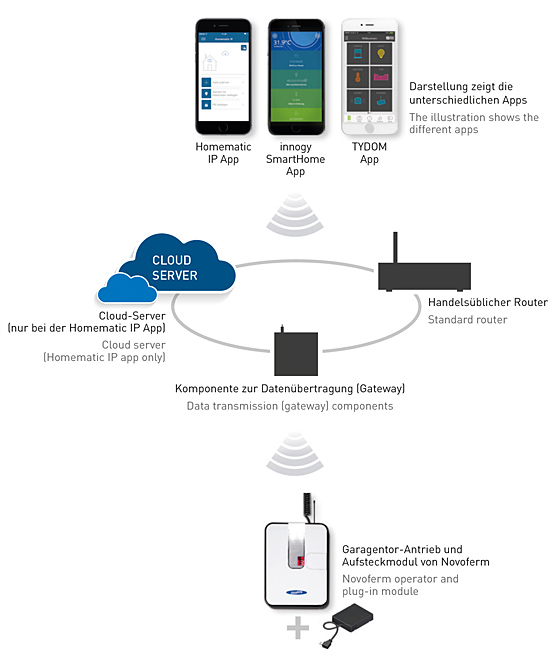 To use the SmartHome app together with Novoferm sectional garage doors, the Novoferm garage door operator is connected to a standard router using the SmartHome access point and the SmartHome plug-in module. The entire solution can be intuitively set up using a free smartphone app (iOS or Android) that can then be used for convenient control.